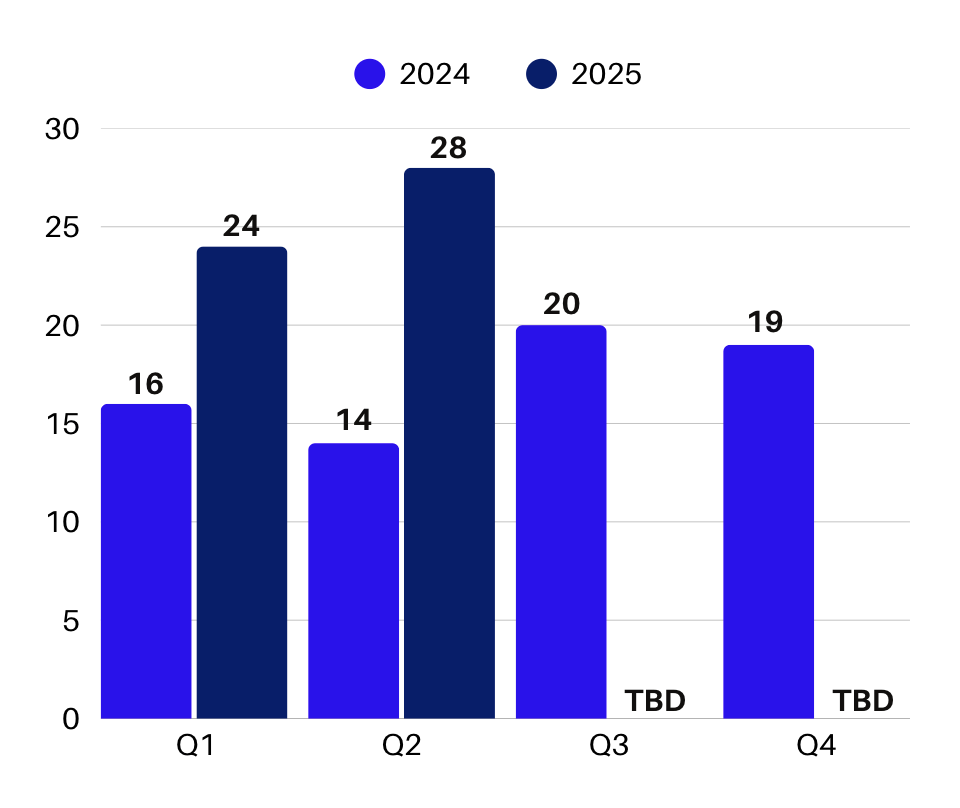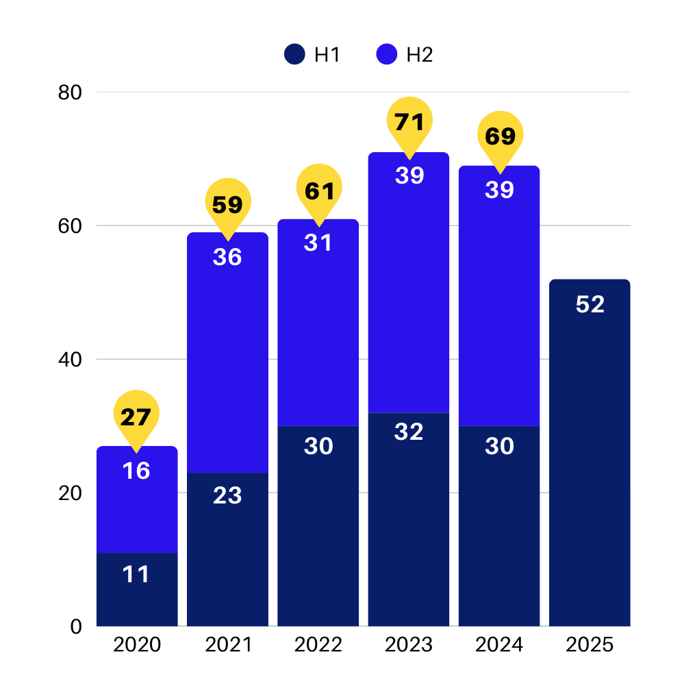 Deal volume increased from 30 transactions in 2024 H1 to 52 transactions in 2025 H1, signaling strong interest and continued growth in the space.