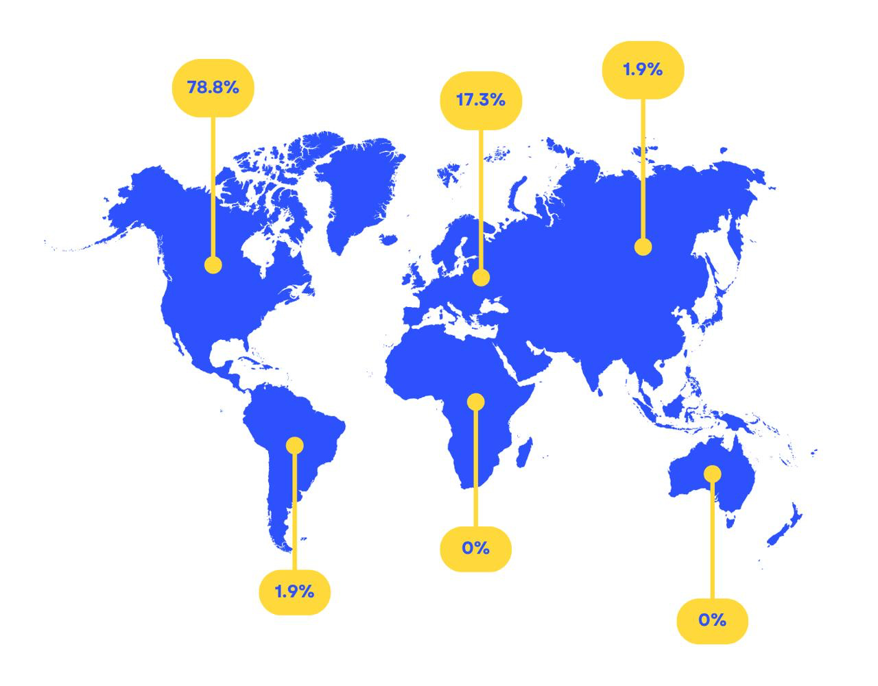 North America dominated H1 transactions, with 78.8% of acquisition targets hailing from the U.S. Much of the remaining activity occurred in Europe, with a few isolated deals in South America and Asia.