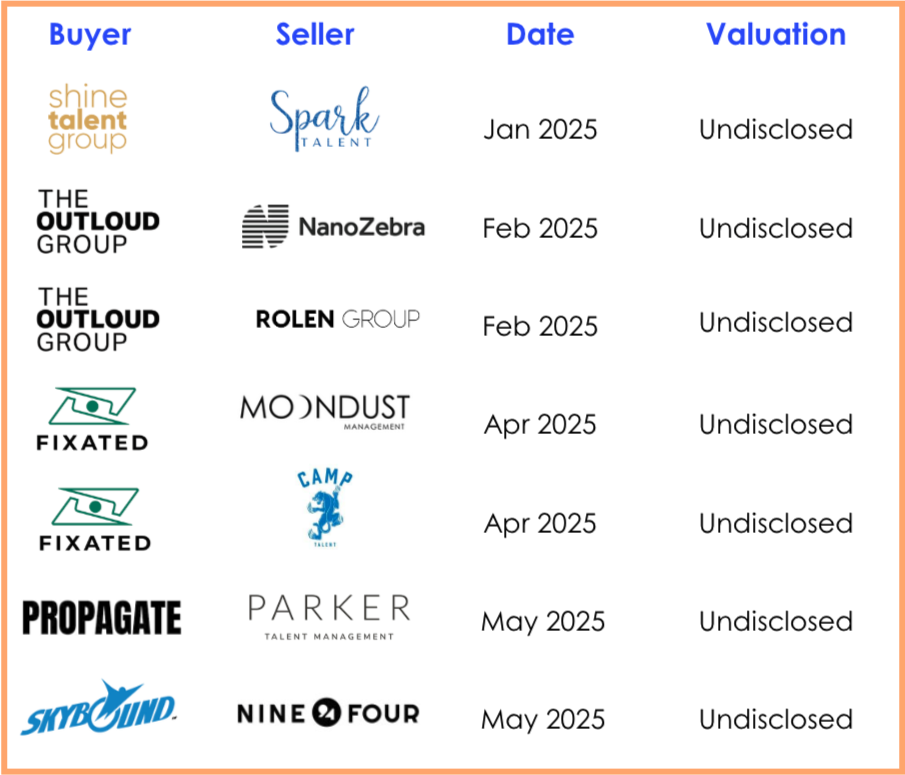 Market consolidation continues among talent representation businesses. M&A activity for this sector was fairly consistent YoY, so we anticipate more talent management acquisitions in H2.
