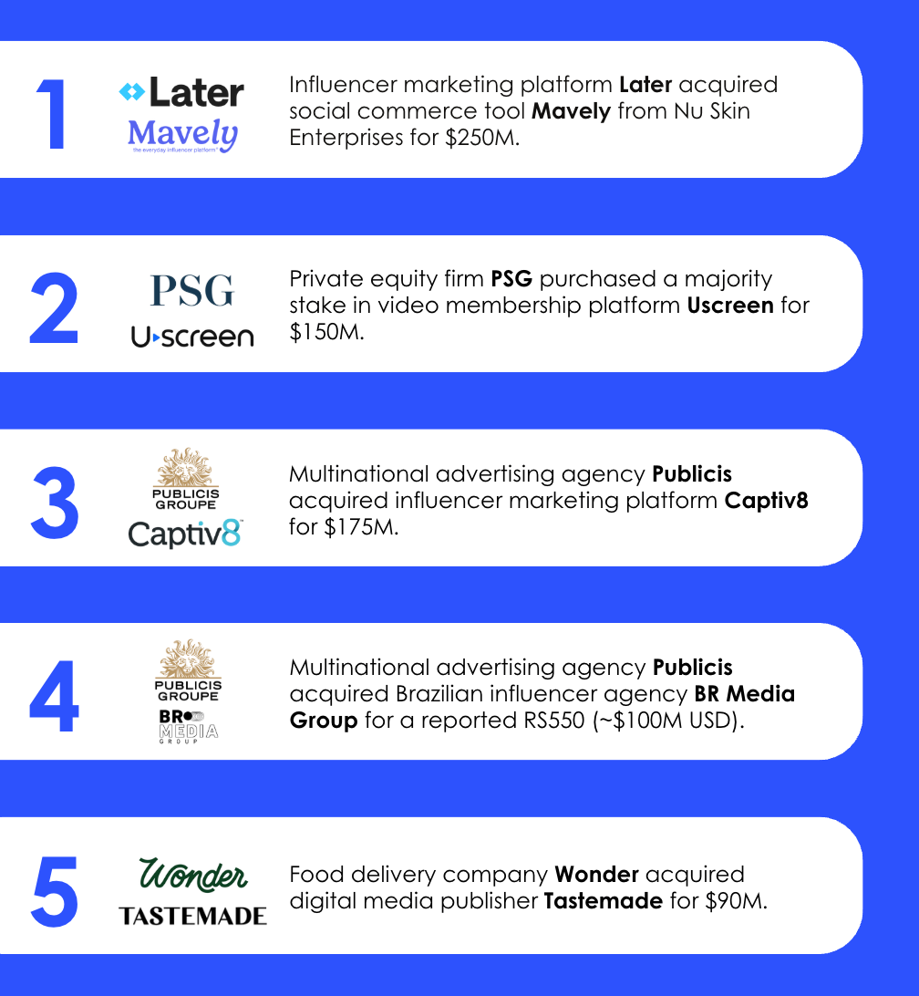We’re starting to see strategic acquisitions from buyers outside the creator economy, including food delivery company Wonder’s acquisition of digital publisher Tastemade and sustainable clothing brand Sown Again’s acquisition of Noah Beck’s genderless underwear brand IPHIS.