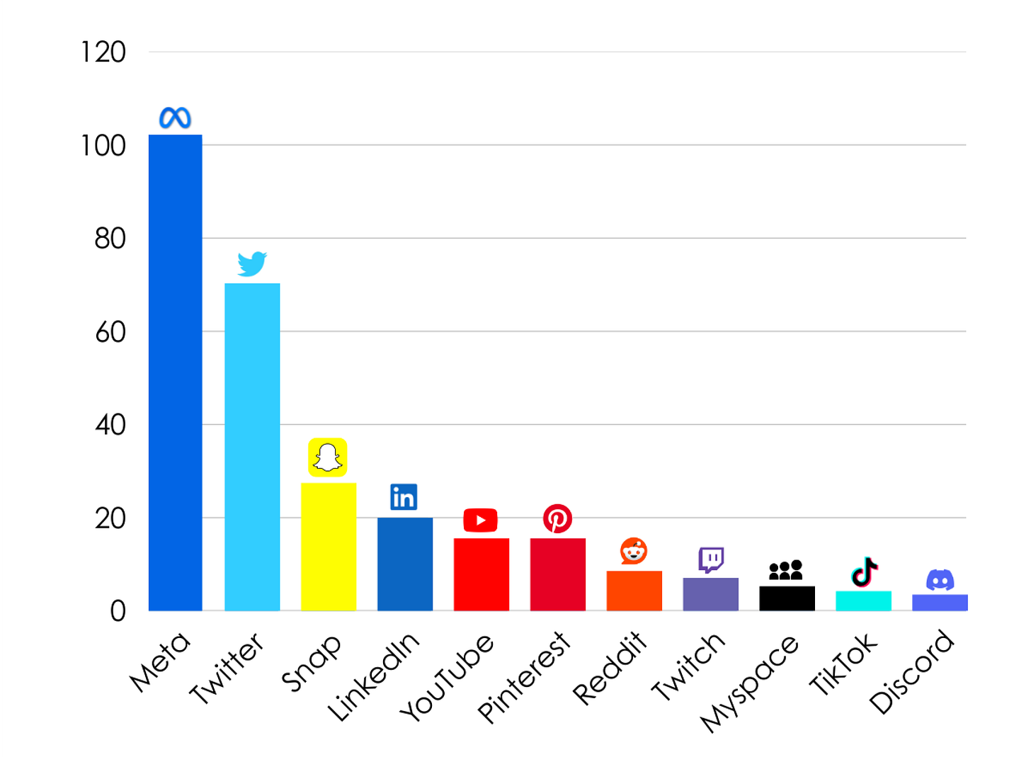 Meta has been the most acquisitive, placing strategic bets on other social platforms (Instagram), messaging (WhatsApp), metaverse and VR (Oculus), and more recently AI startups (PlayAI). Twitter (now X) has been the second most active, followed by Snap, LinkedIn, and YouTube.