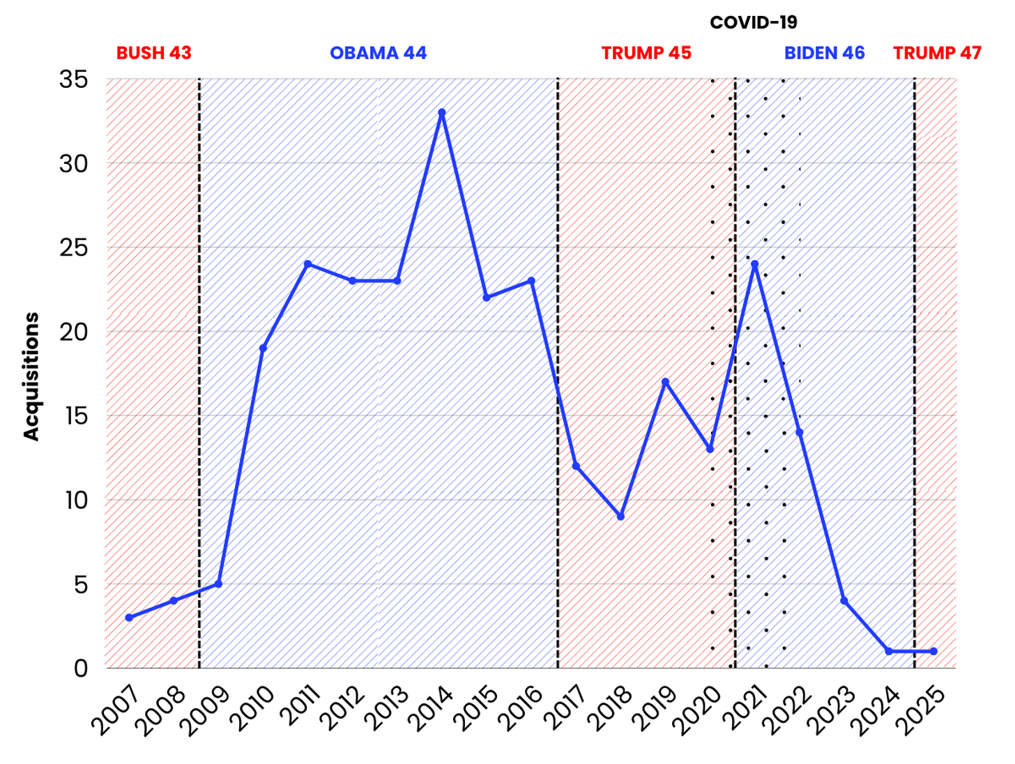 The chart below, which plots acquisition activity against the U.S. Federal Funds Effective Rate, makes this relationship clear: periods of easy money coincide with surges in M&A, while tighter monetary policy tends to cool the deal-making environment.