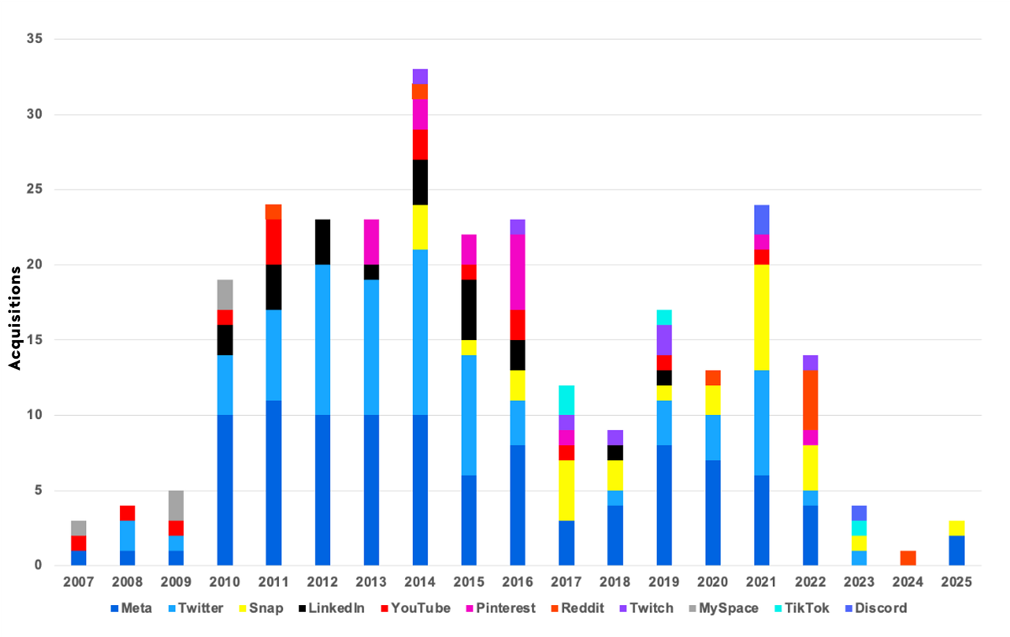 In the 2010s, social media platforms were some of the most aggressive acquirers in tech. For years, acquisitions were the fastest way to capture new audiences, add features, and fend off competition.