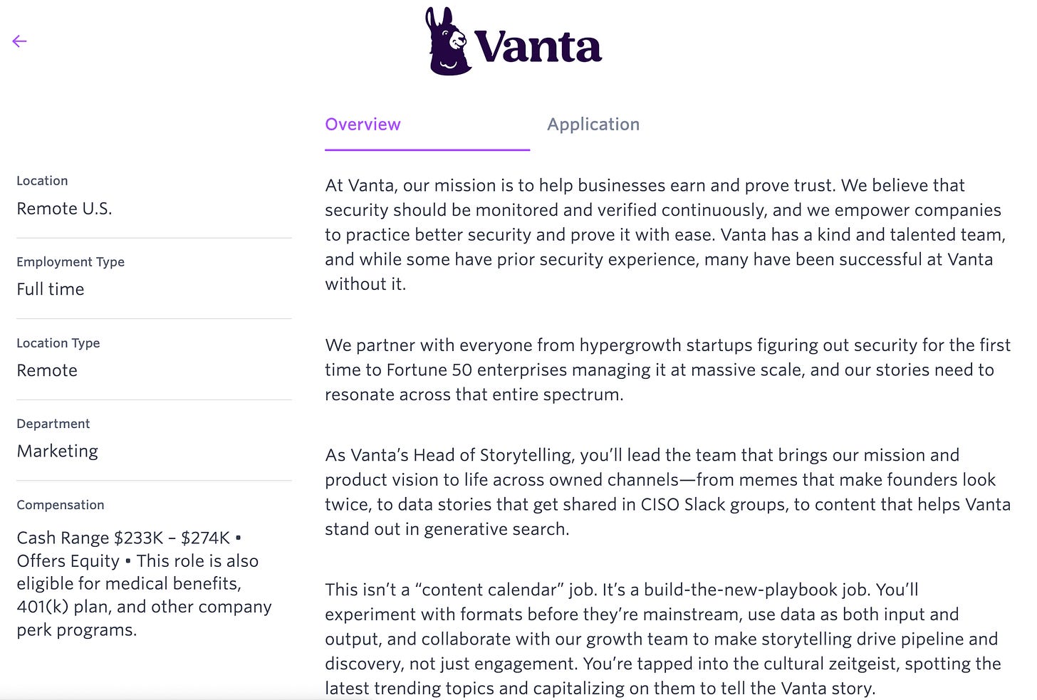 Some companies are already jumping in — cybersecurity startup Vanta is hiring a Head of Storytelling with compensation around USD $274K.