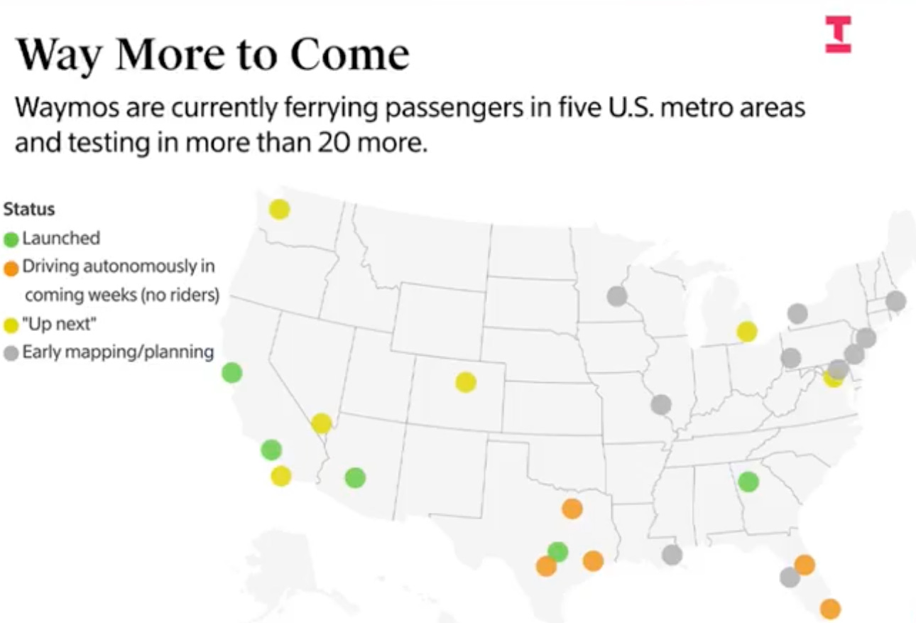 Waymo sits at a $100B valuation — 280x its revenue — betting that long-term dominance in ride-hailing will justify the premium. The self-driving company is currently operating and testing in 25 U.S. metro areas.