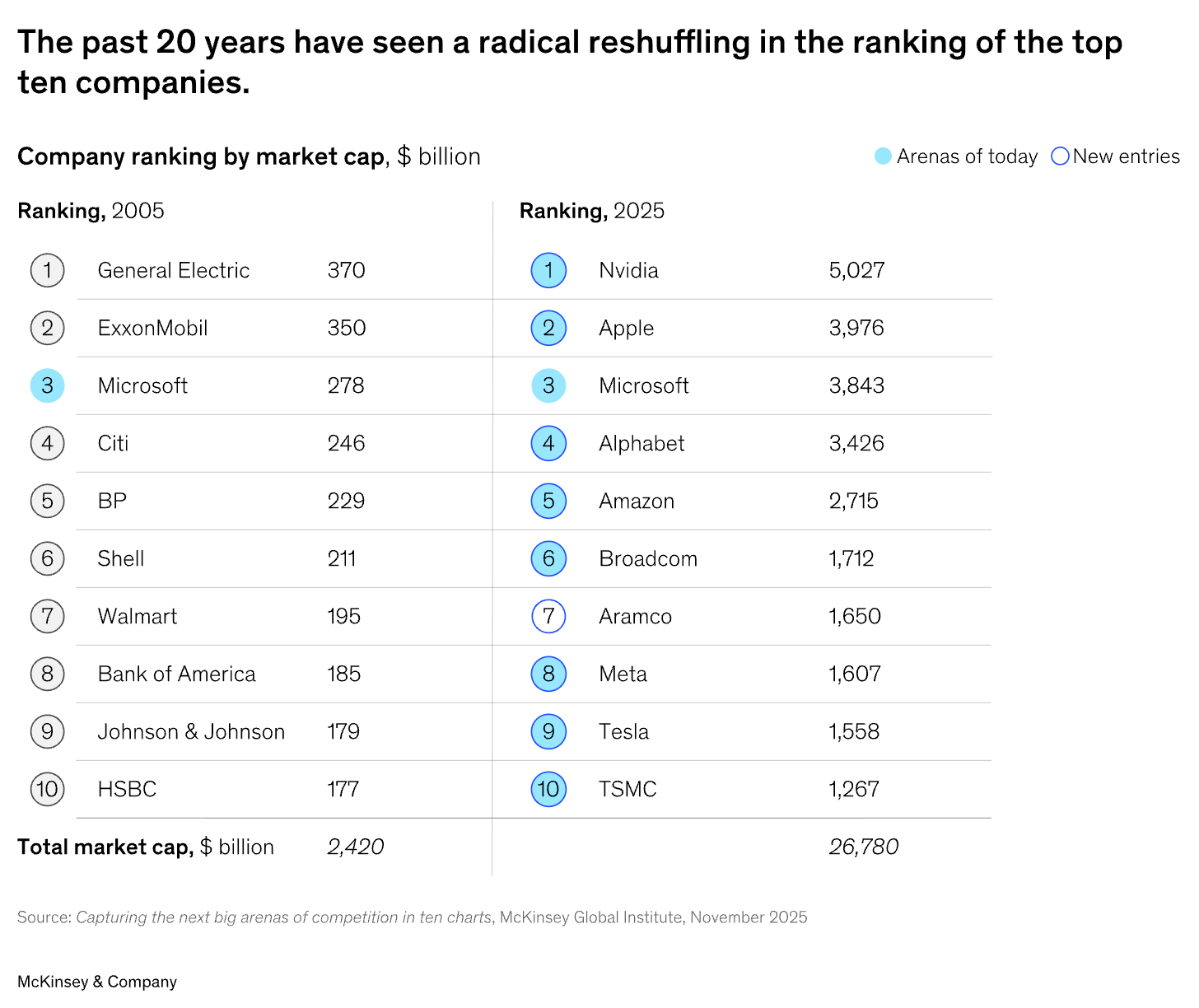 The corporate landscape has transformed radically in 20 years, with only one company remaining in the top ten most valuable list, while 2025’s leaders are worth roughly ten times their 2005 predecessors.