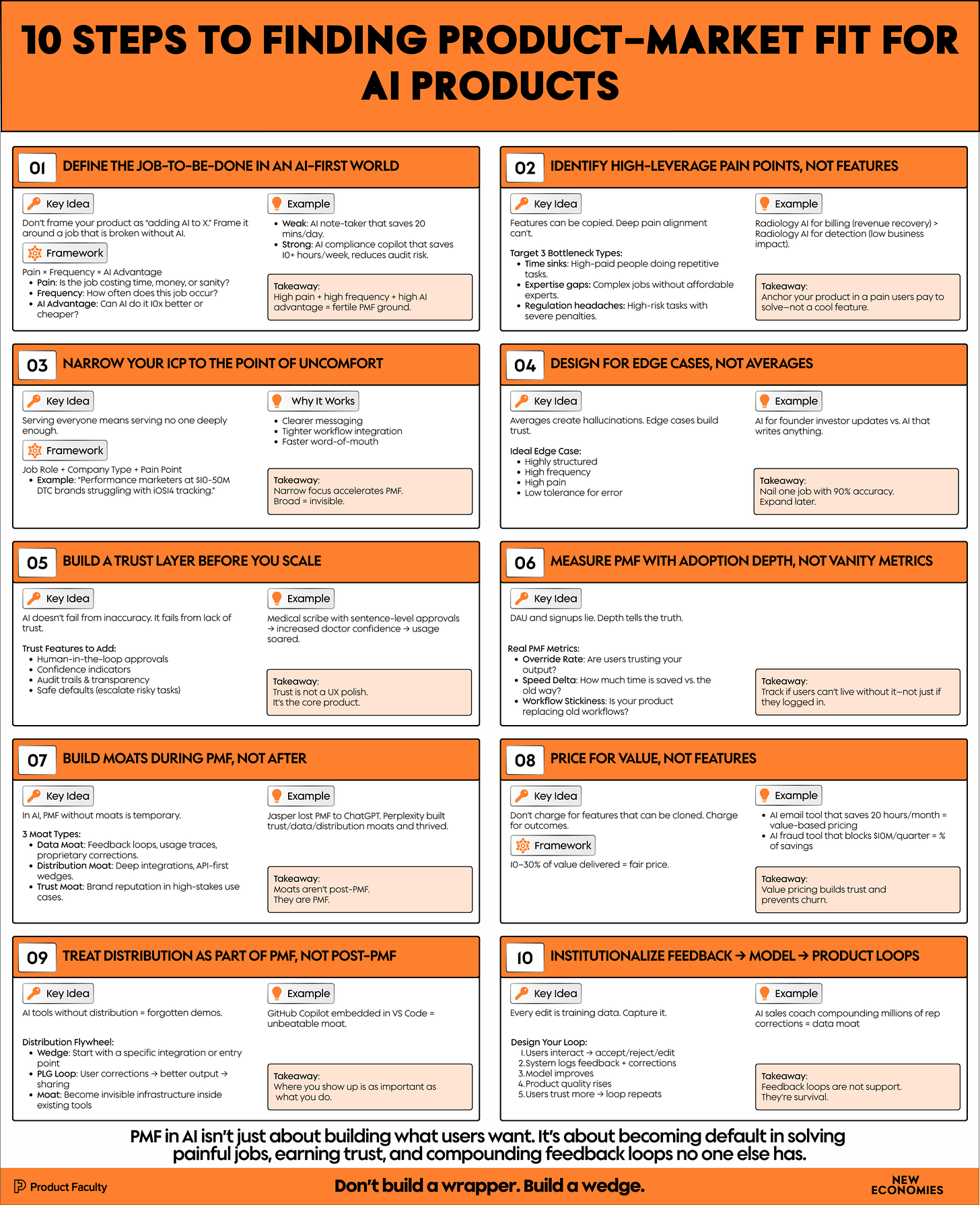 That’s why this guide exists. I want to give you a clear, actionable, deeply practical set of steps so that if you’re building an AI product, you know exactly how to go from a shiny model wrapper to a defensible company with true product-market fit.