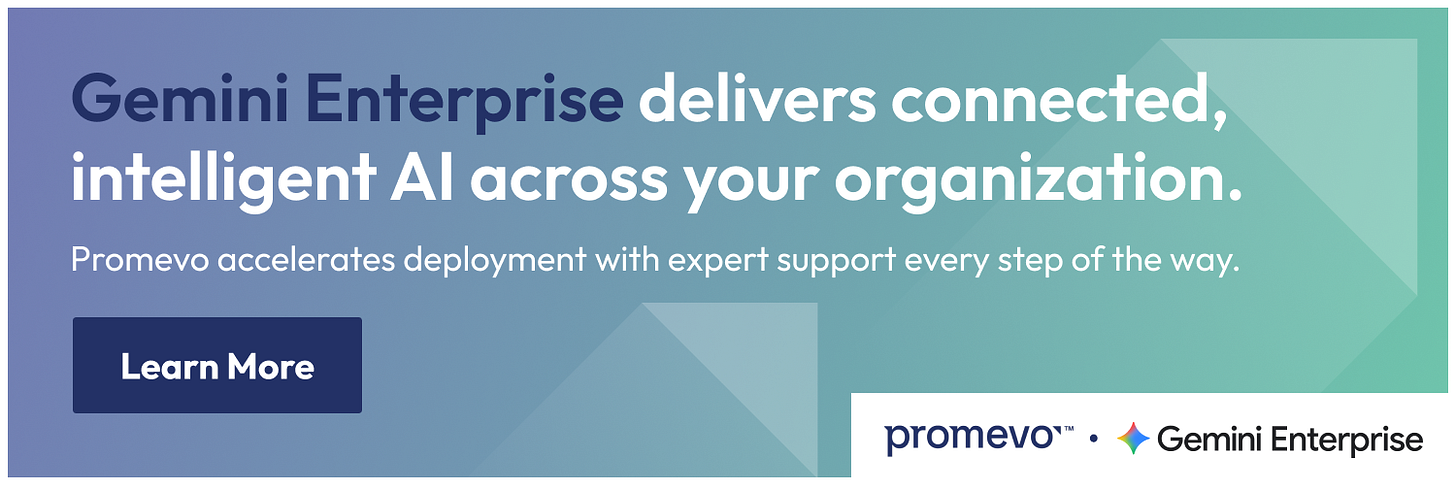 Innovation shouldn’t slow down waiting for integration. Gemini Enterprise from Google connects your data, tools, and teams through secure AI agents that automate workflows and surface insights faster. With Promevo, you can deploy it seamlessly, scale it confidently, and get more from your AI investment from day one.