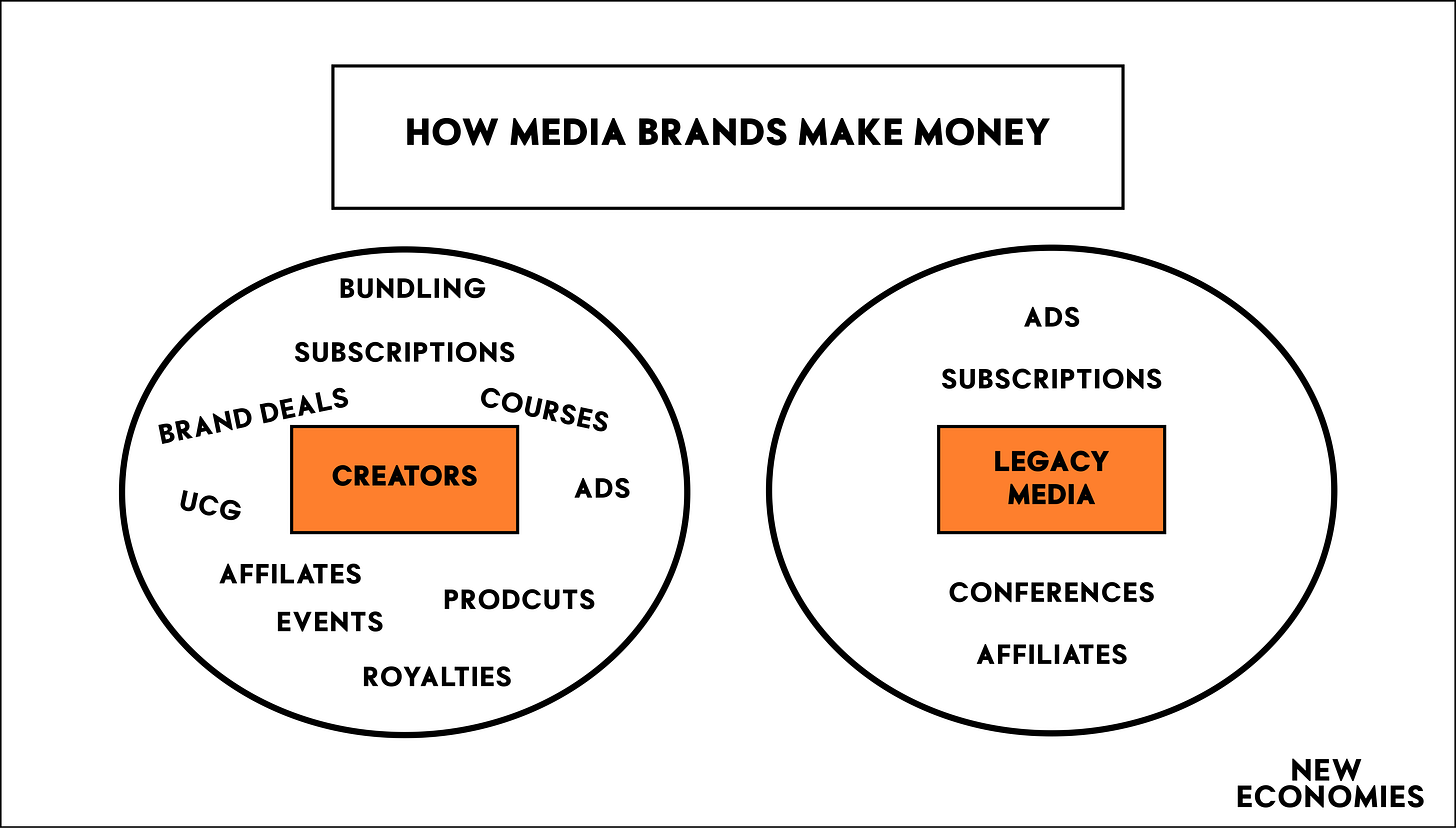 Legacy media, by contrast, is still dominated by ads and subscriptions — slow, rigid models that make experimentation difficult.