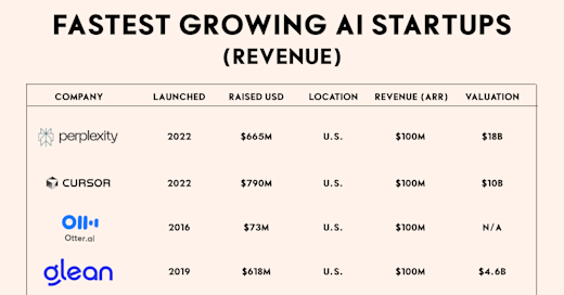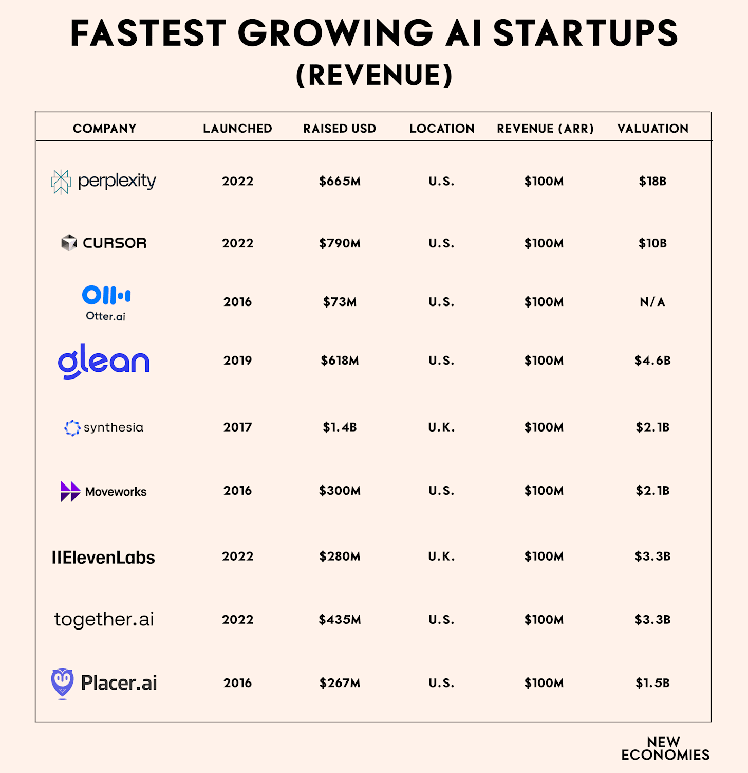 AI is at an inflection point. Startups are reaching $100M in annual recurring revenue (ARR) faster than ever. For example, Cursor hitting a $100M revenue run rate within just 12 months would place it among the fastest-growing enterprise software companies in history.