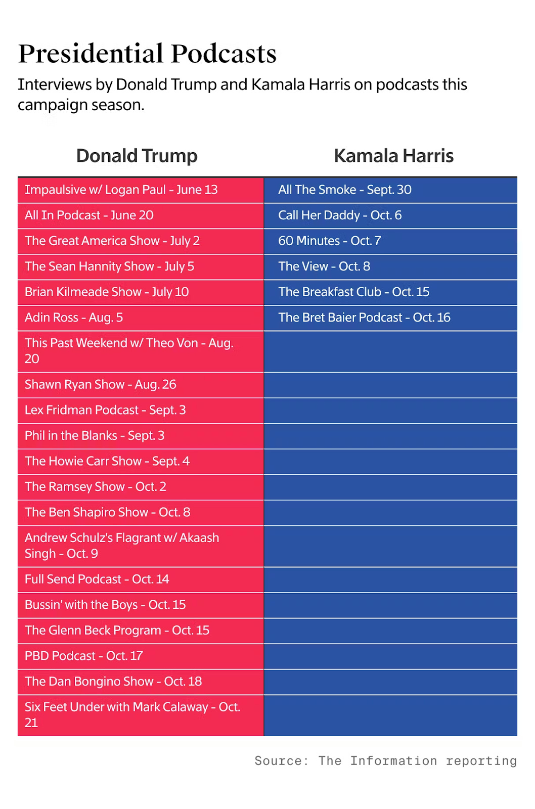 Trump appeared on The Ben Shapiro Show, Joe Rogan, and The Glenn Beck Program, while Harris joined Call Her Daddy and 60 Minutes.