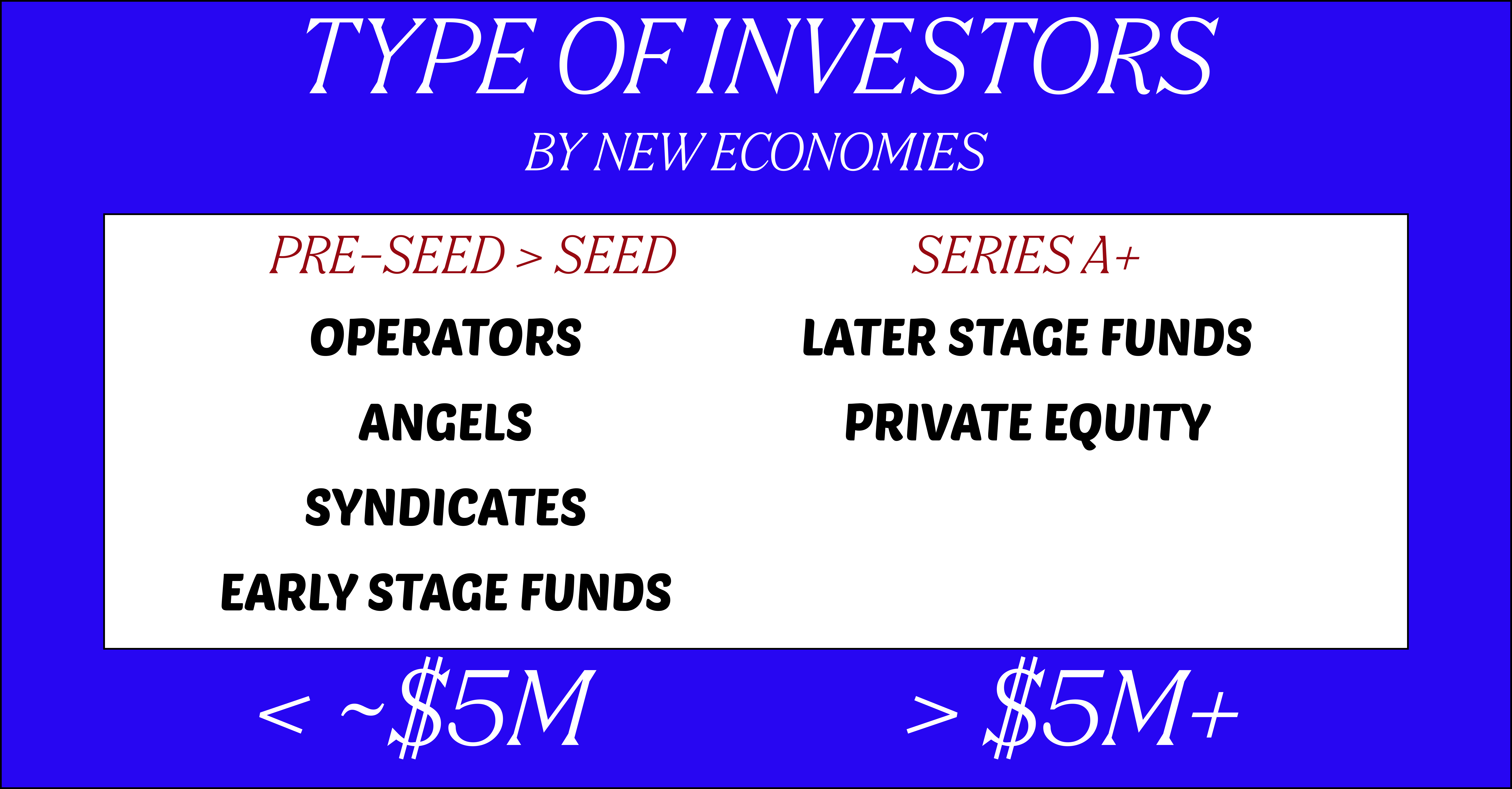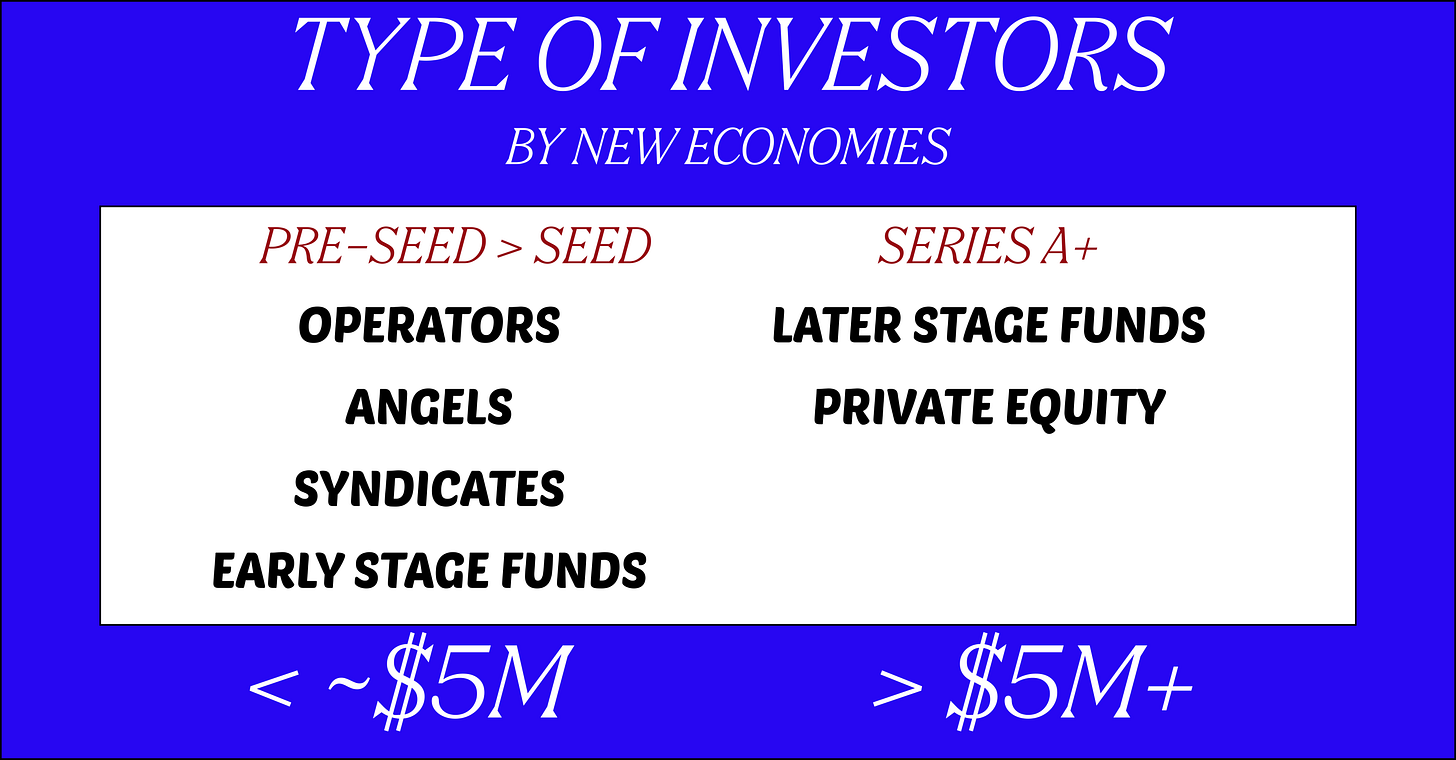 When founders go out to raise, they can approach various types of investors. Early-stage startups typically engage a blend of operators, angel investors, early-stage funds, and sometimes angel syndicates. As these startups progress and raise additional funding, their investor base usually evolves to include later-stage venture funds, as well as growth funds, and eventually private equity firms.