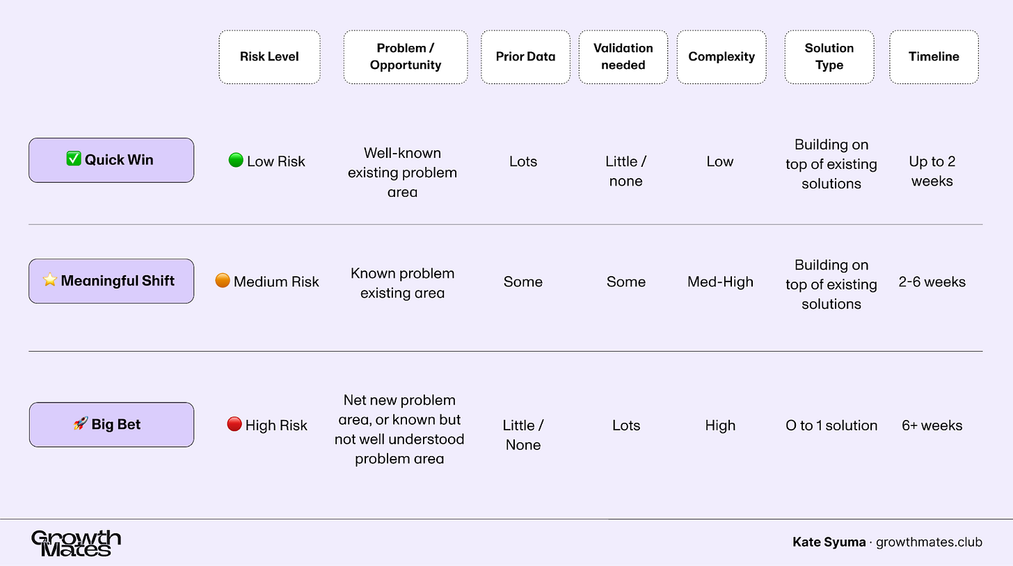 Foundations always come first. Without clarity on your Activation metric, clear onboarding, or a working self-serve funnel, big bets won’t land. A diverse portfolio isn’t just about spreading risk — it’s about sequencing growth work so every step compounds. So let’s explore how to categorize your roadmap across Quick Wins, Meaningful Shifts, and Big Bets — and how to know where to start.