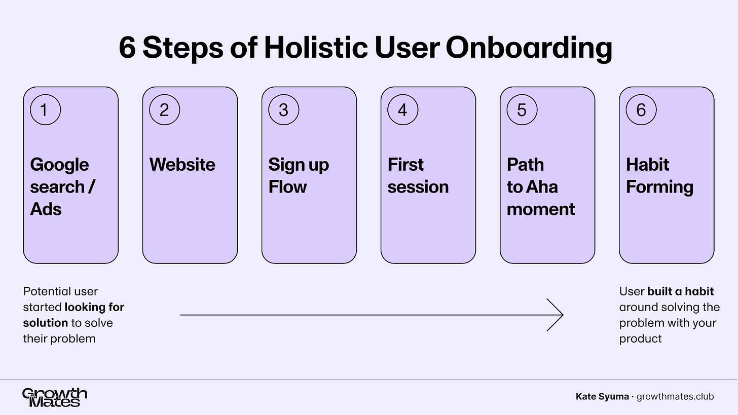 User Onboarding ≠ First session. This is a holistic user journey that starts when a potential user started looking for a solution to solve their problem. It ends when the user built a habit around solving the problem with your product.